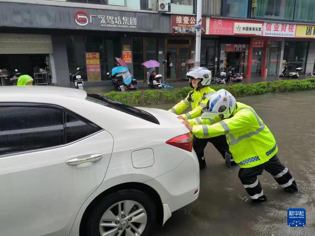 9月8日,深圳交警鐵騎隊員在深圳市光明區積水路段協助將被困車輛推移至安全地帶。
