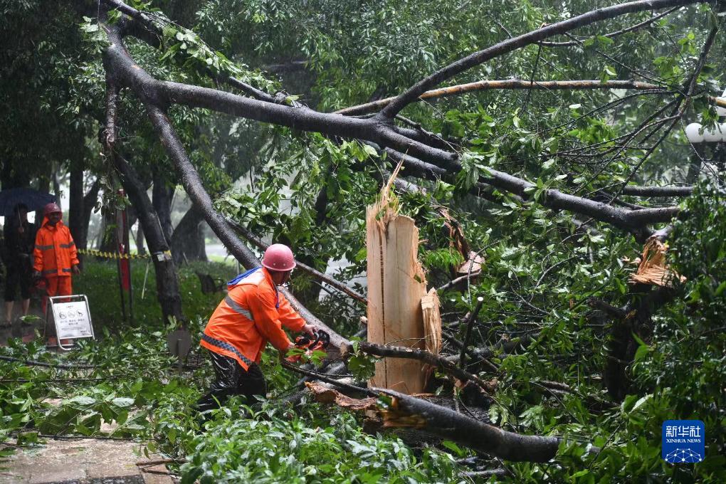 9月8日,深圳園林綠化工人冒雨清理倒伏的樹木。