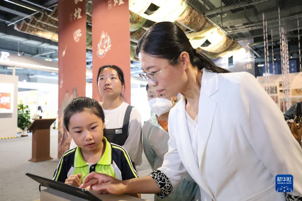 9月7日,觀眾在第六屆絲綢之路(敦煌)國際文化博覽會世界文化遺產保護典范和敦煌學研究高地建設成果展上感受數字繪壁畫裝置。