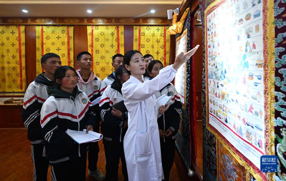 9月8日,在果洛藏族自治州職業技術學校,藏醫醫療與藏藥專業學生跟隨授課老師觀看藏醫典籍唐卡。