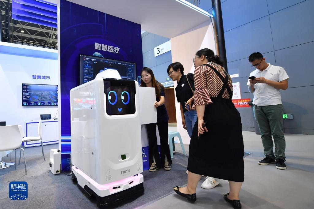9月8日,工作人員(左一)在數博會上向參觀者介紹醫療物資配送機器人。