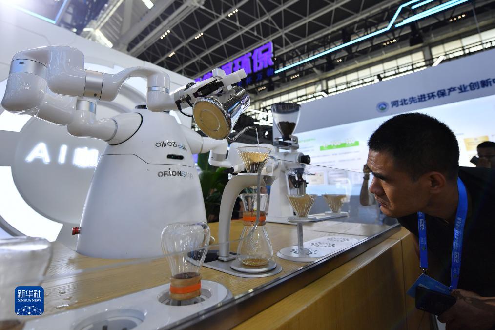 9月6日,參觀者在數博會上觀看AI咖啡手沖機器人制作咖啡。