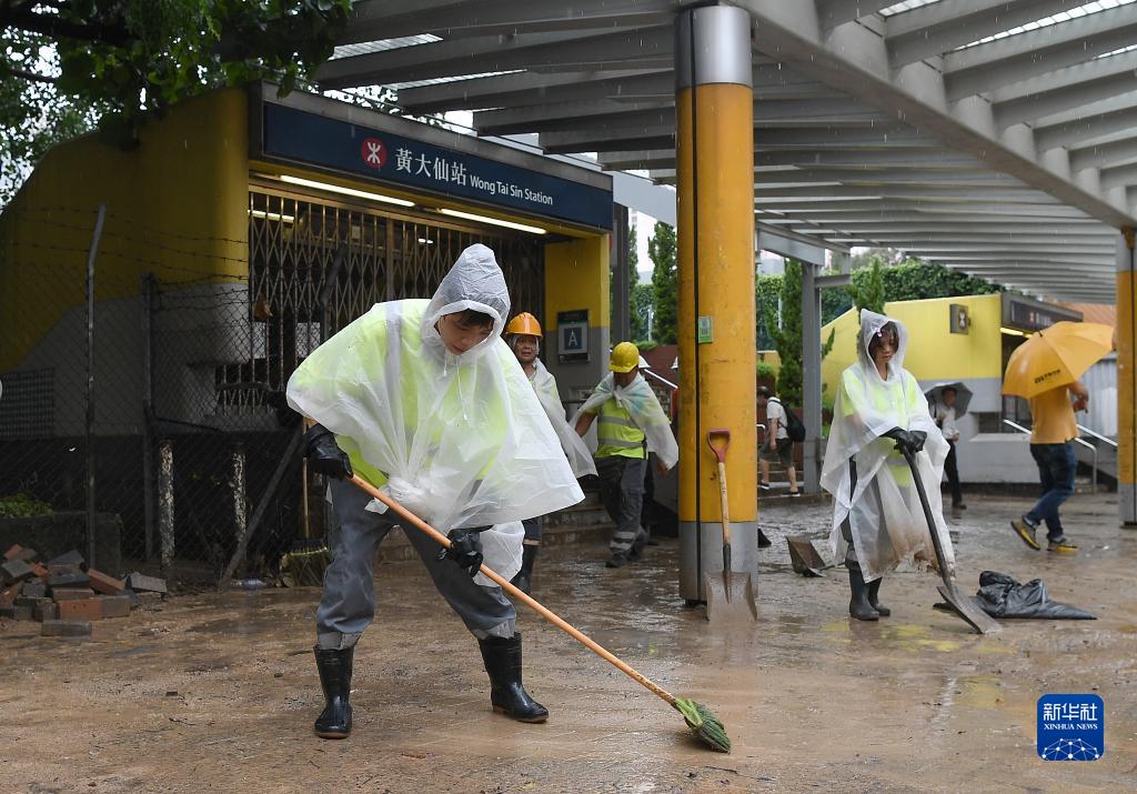 9月8日,工作人員在香港黃大仙地鐵站外清理淤泥。