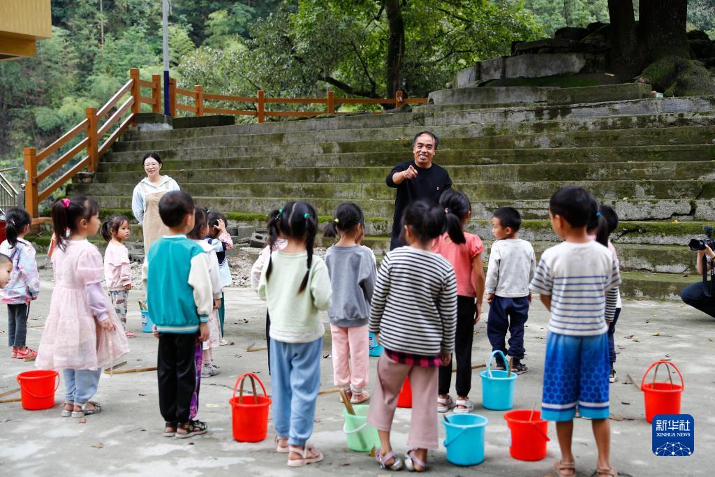在烏英苗寨教學點,潘先鋒(后排右)和同事在教新生學習排隊(2023年8月30日攝)。
