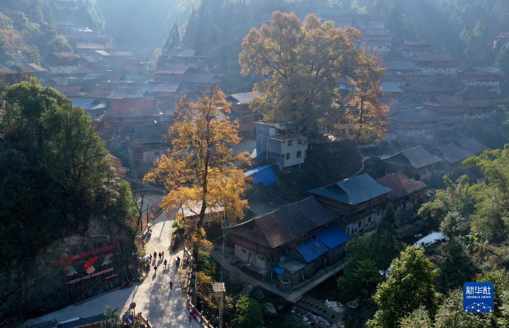 烏英苗寨教學點的孩子們在潘先鋒的帶領下巡寨搞衛生(無人機照片,2022年12月21日攝)。