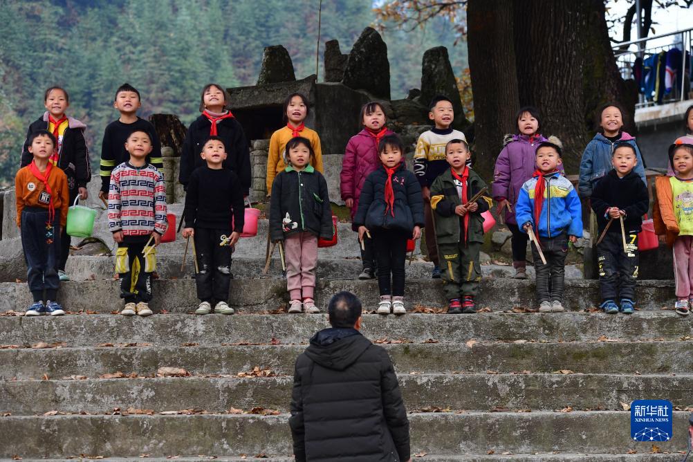 在烏英苗寨教學點,潘先鋒在指導孩子們進行隊列訓練(2021年12月9日攝)。