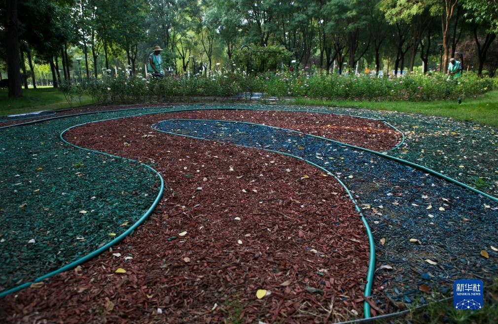 9月7日在德州市行政中心綠地拍攝的用園林綠化垃圾循環再造的園林景觀。