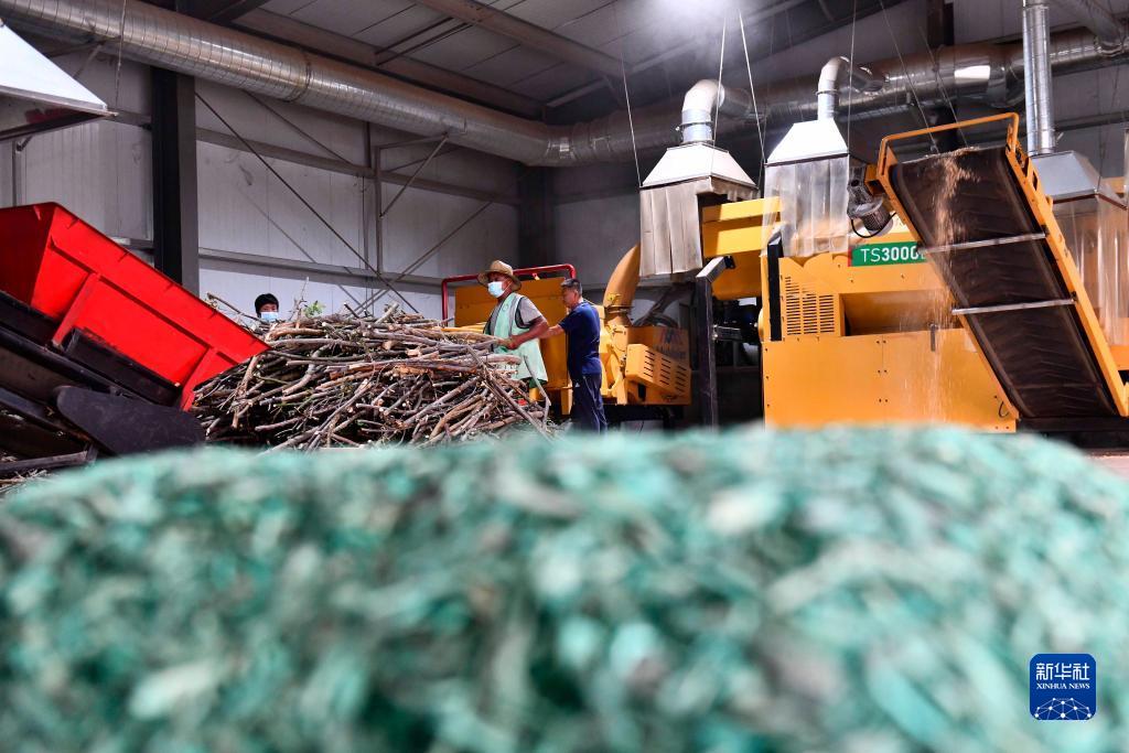 9月7日,在德州市碳循環創新示范基地,工作人員對園林綠化垃圾進行粉碎加工作業。