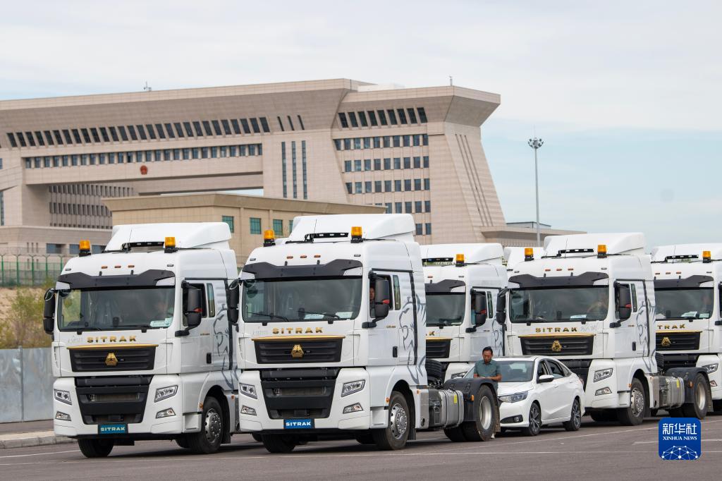 這是在霍爾果斯公路口岸等待出口的車輛(9月6日攝)。