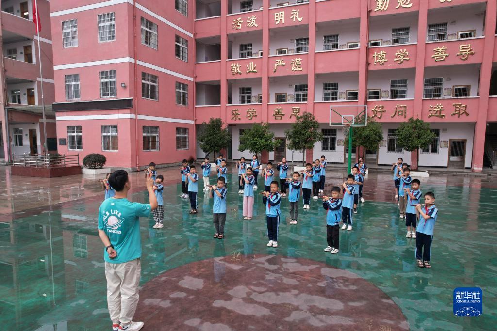 在江西省吉安市泰和縣水槎鄉中心小學,竹笛班的孩子們在操場上練習合奏(9月5日攝)。