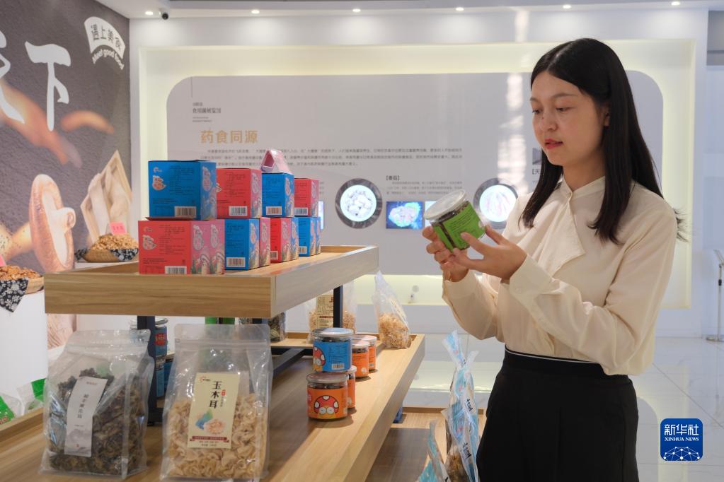 9月8日,消費者在山陽縣食用菌產業園商品展示大廳挑選產品。