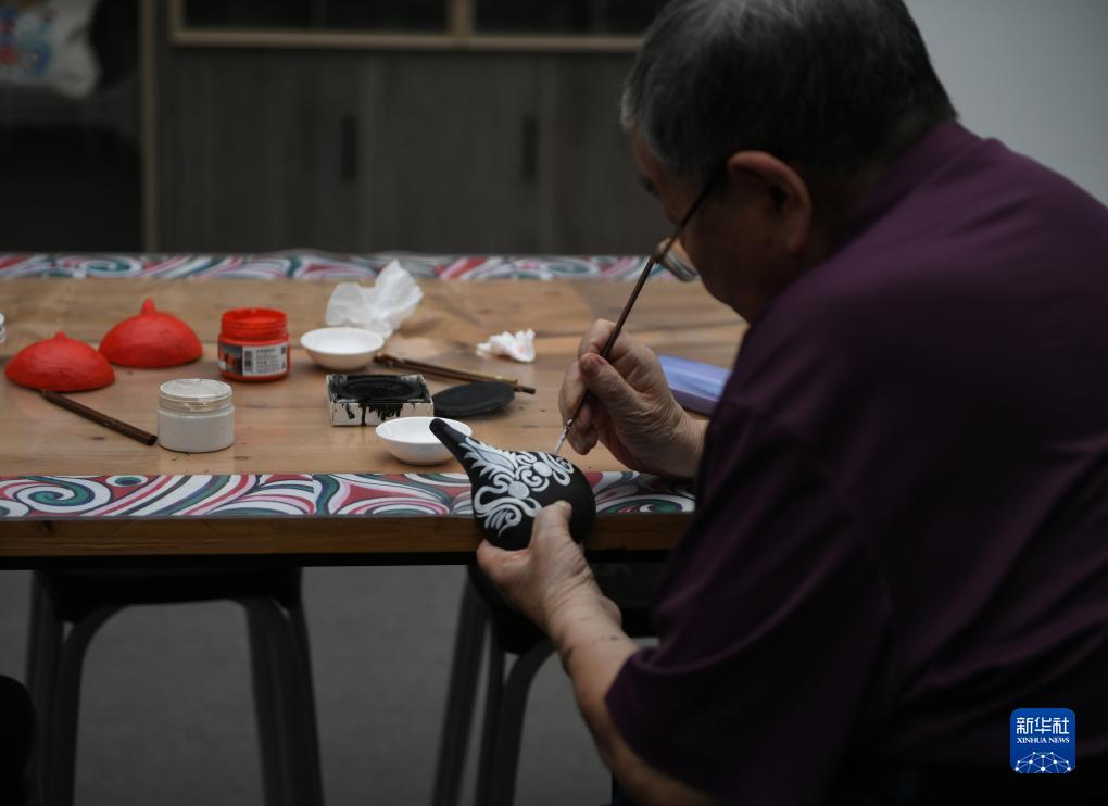9月8日,在陜西寶雞市西府里文化藝術村,中國工藝美術大師、陜西省非物質文化遺產社火臉譜繪制技藝代表性傳承人李繼友在繪制馬勺臉譜。