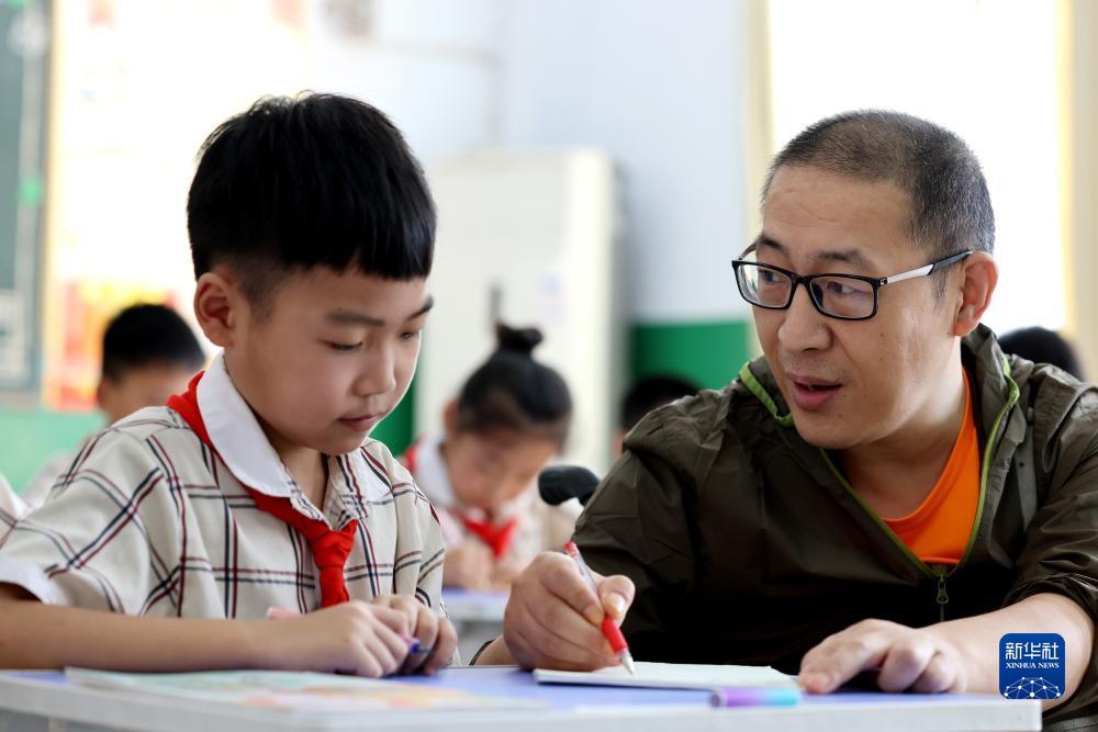9月5日,在山東省棗莊市永安鎮遺棠小學,楊季剛在輔導四年級學生英語。