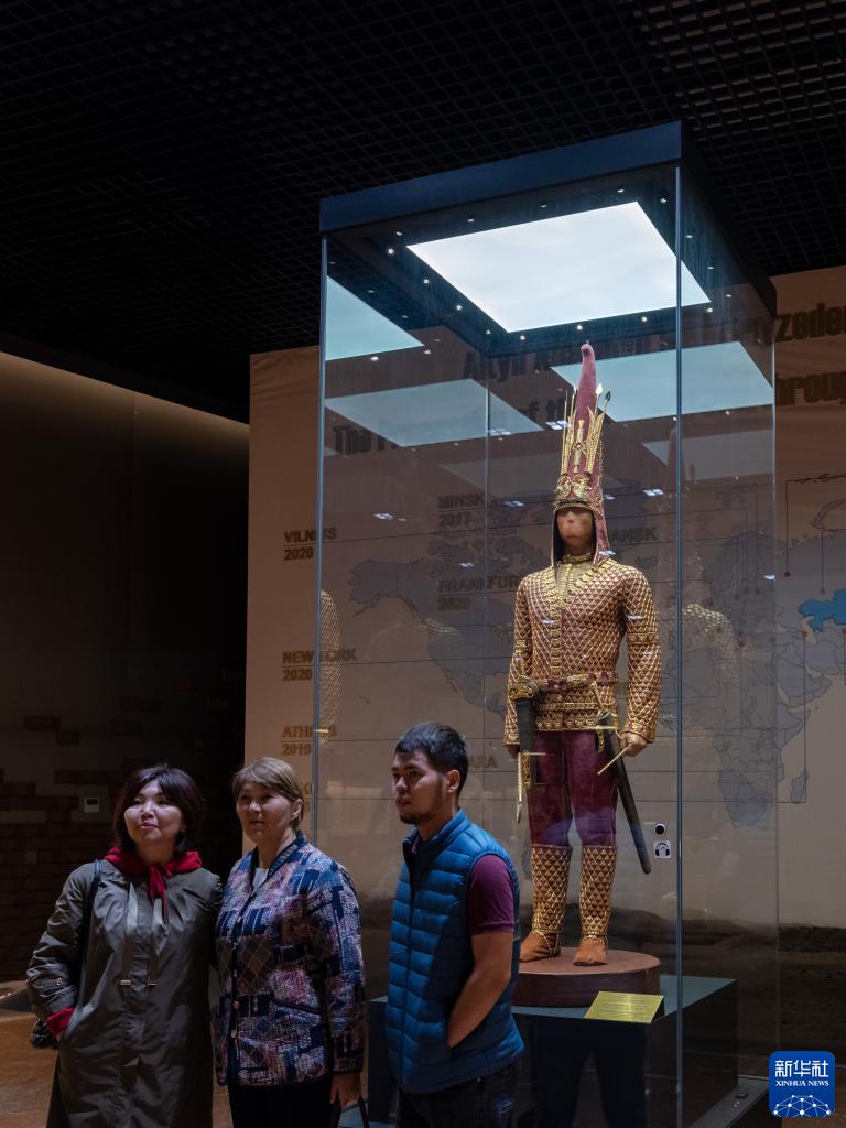 9月8日,在哈薩克斯坦首都阿斯塔納的哈薩克斯坦國家博物館,人們參觀伊塞克金人墓出土的服飾及武器復原展示。