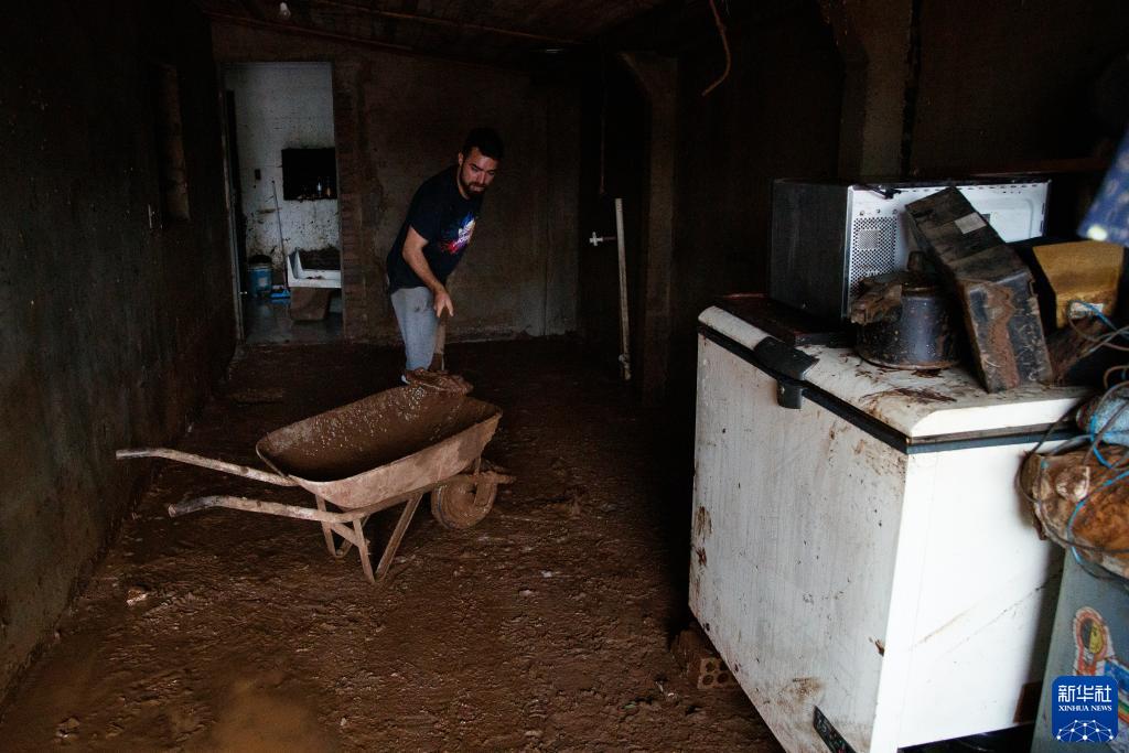 9月8日,在巴西南里奧格蘭德州埃斯特雷拉,一名男子清理家中的淤泥。