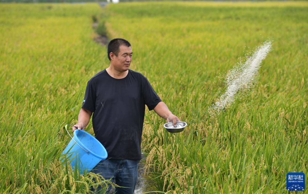 9月8日,農民在沈陽市沈北新區興隆臺街道青年農場稻田里投喂河蟹。