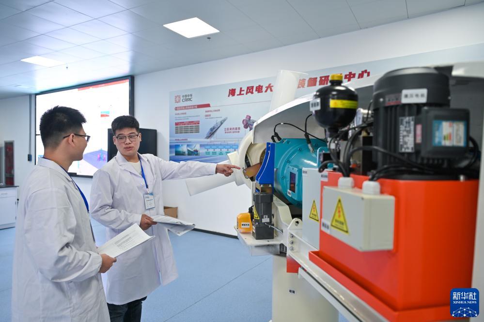 工作人員在江蘇省鹽城市射陽港低(零)碳產業園中車海上風電大功率裝備研發中心記錄風電機組縮比控制綜合實驗系統數據(9月8日攝)。
