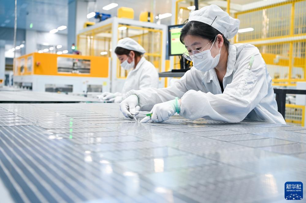 工人在江蘇省鹽城市建湖縣悅陽光伏科技有限公司生產車間內作業(9月6日攝)。