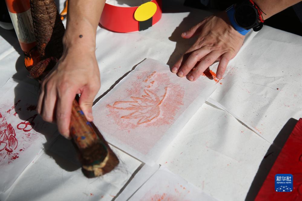 9月8日,參觀者在比利時布魯塞爾漫畫節中國館展區體驗木版水印。
