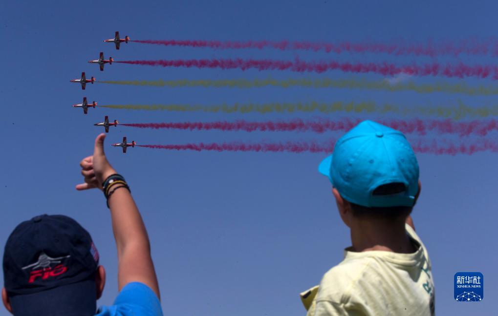 9月2日,人們在希臘塔納格拉空軍基地舉行的雅典飛行周上觀看西班牙飛行表演隊的表演。