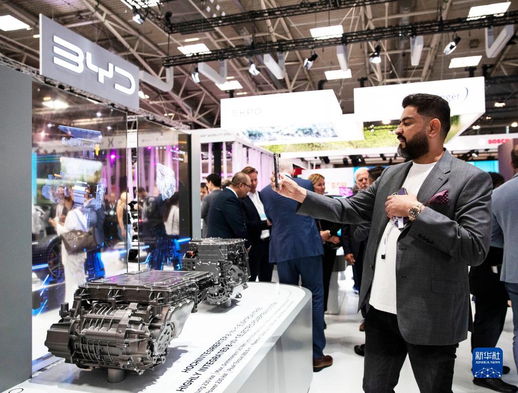 9月4日,一名參觀者在德國慕尼黑國際車展媒體預展上拍攝比亞迪的展品。