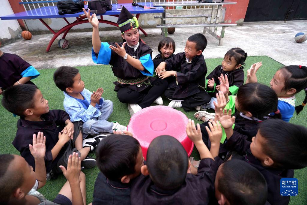 柳吉小學教師王章艷帶領學生在課間玩游戲(9月7日攝)。