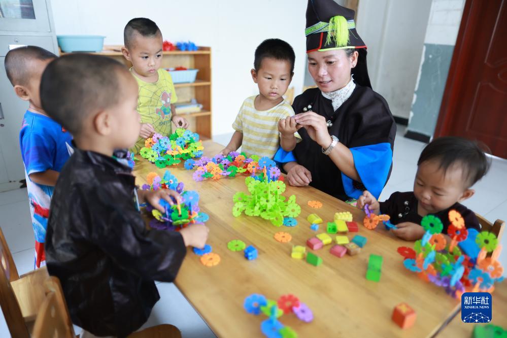 柳吉小學教師王章艷陪學生一起玩玩具(9月7日攝)。