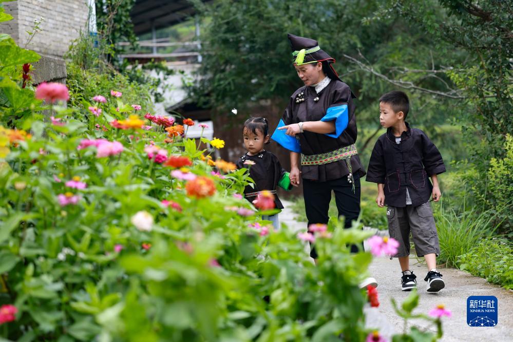 柳吉小學教師王章艷(中)在去往學生龍運平(右)和龍運凡家中家訪的路上(9月7日攝)。