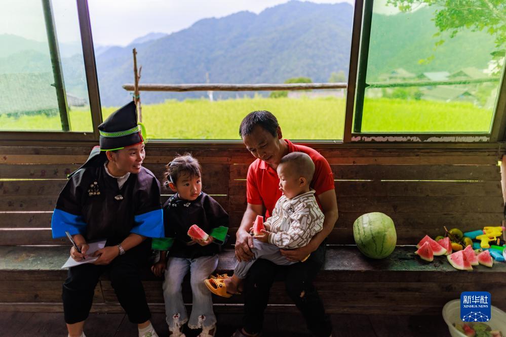 柳吉小學教師王章艷(左一)在學生龍運凡(左二)家中家訪(9月7日攝)。
