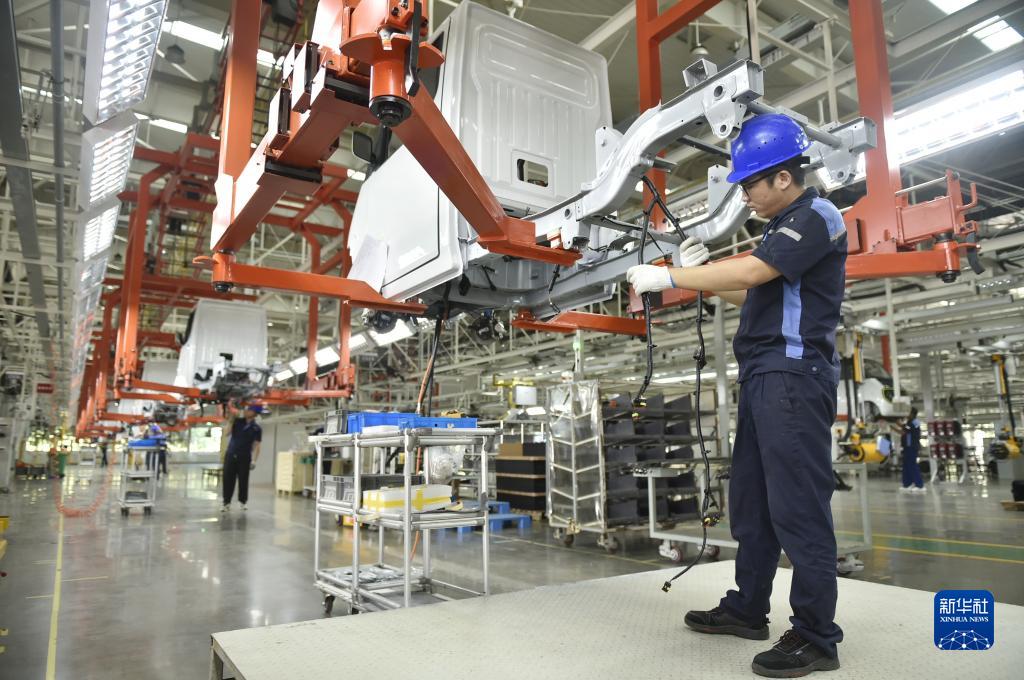 9月8日,河南省安陽市安陽縣一家新能源汽車制造企業的工作人員在車間進行裝配作業。