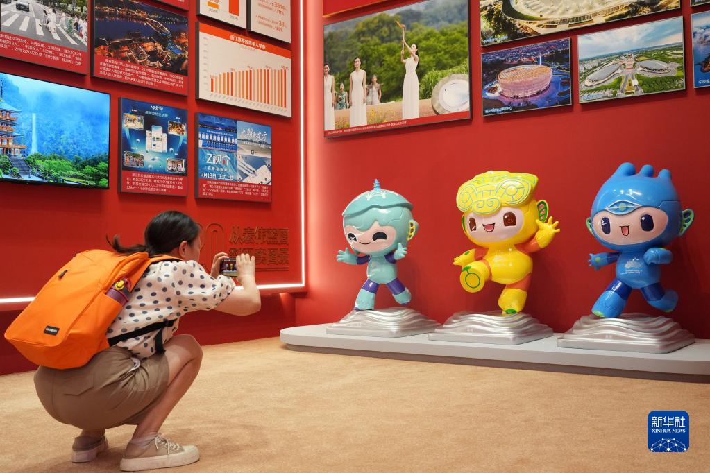 9月9日,參觀者在大道之行——“八八戰略”實施20周年大型主題展覽上拍攝杭州亞運會吉祥物。