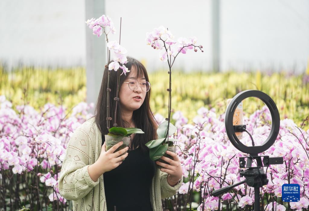 9月9日,工作人員在宿遷市王官集鎮蝴蝶蘭大世界大棚內進行網絡直播。