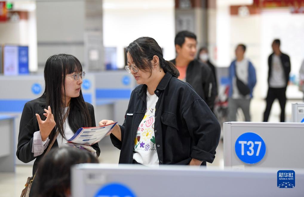 9月9日,求職者(左)在招聘會現場與用人單位工作人員交流。