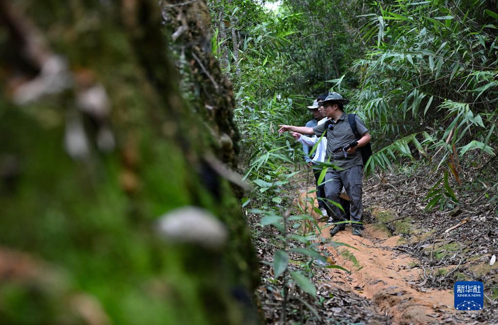9月5日,曾念開(前)和學生在海南鸚哥嶺熱帶雨林考察。