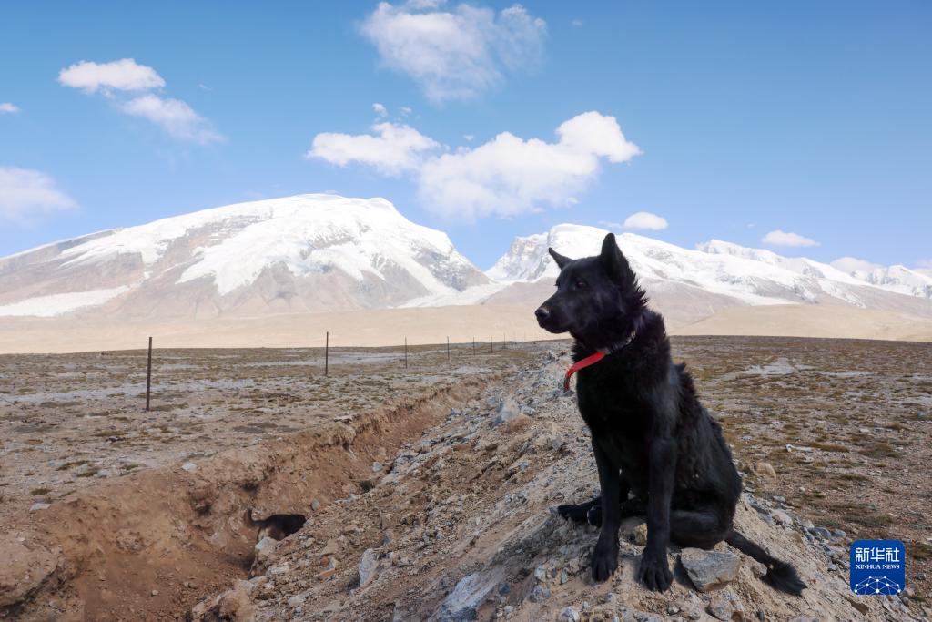 牧羊犬“黑狼”在草場邊等待羊群吃草(9月6日攝)。