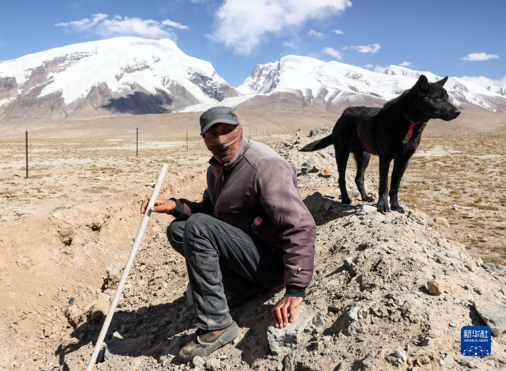 今年39歲的塔合曼鄉薩熱拉村牧民庫爾班艾里·買達賽因與牧羊犬“黑狼”一起遠遠地看著羊群(9月6日攝)。