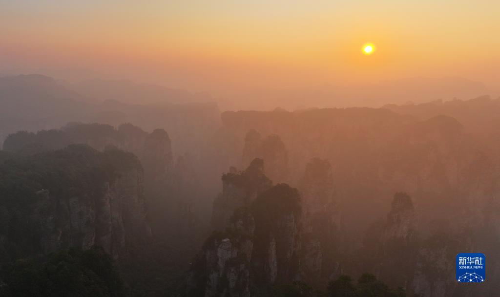 當日清晨,在湖南張家界國家森林公園黃石寨,朝陽的光芒將峰林渲染,繪就出一幅唯美夢幻的自然畫卷。