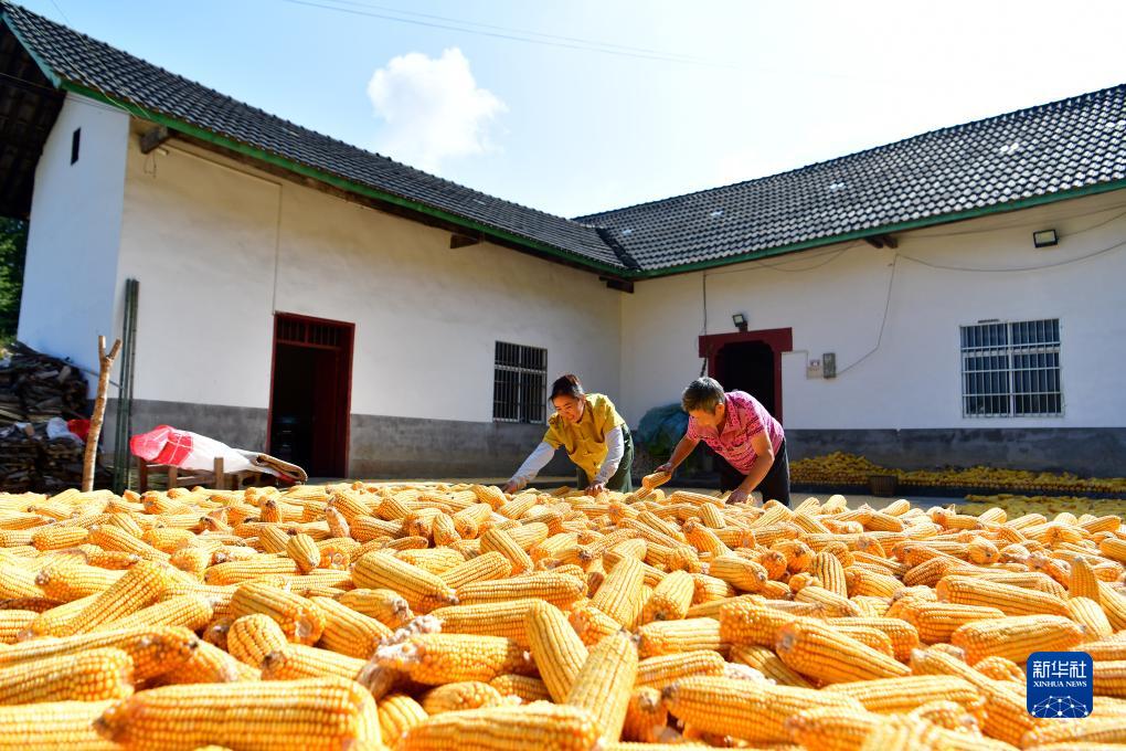 9月9日,秭歸縣九畹溪鎮穿心店村的村民在翻曬玉米。