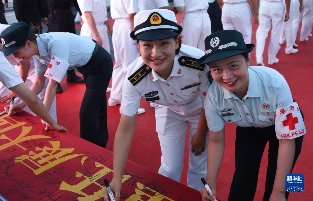 中國海軍“和平方舟”號醫院舉行跨越赤道儀式,文職人員和軍人在橫幅上簽字(7月22日攝)。