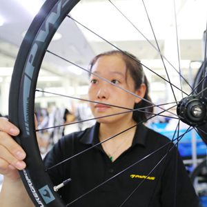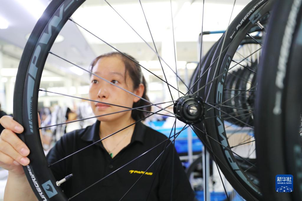 9月9日,在山東樂陵市一家企業的碳纖維自行車生產車間,工人在檢驗輪組。