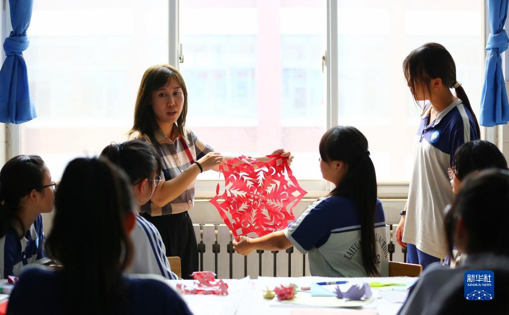 9月9日,在山東省樂陵市開元中學,老師指導學生學習剪紙。新華社發(李志軍 攝)
