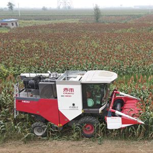 9月9日,收割機在鹽山縣小營鄉王姑娘村的鹽堿地上收割高粱。