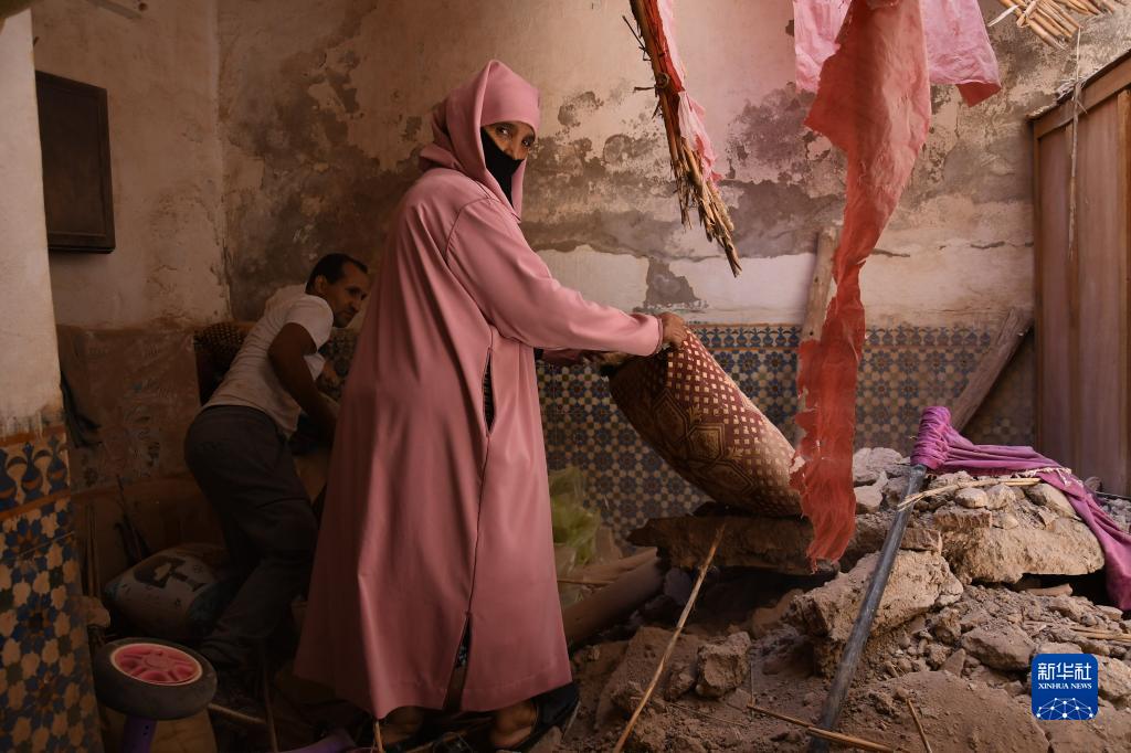 這是9月9日在摩洛哥南部城市馬拉喀什拍攝的受損建筑內的居民。