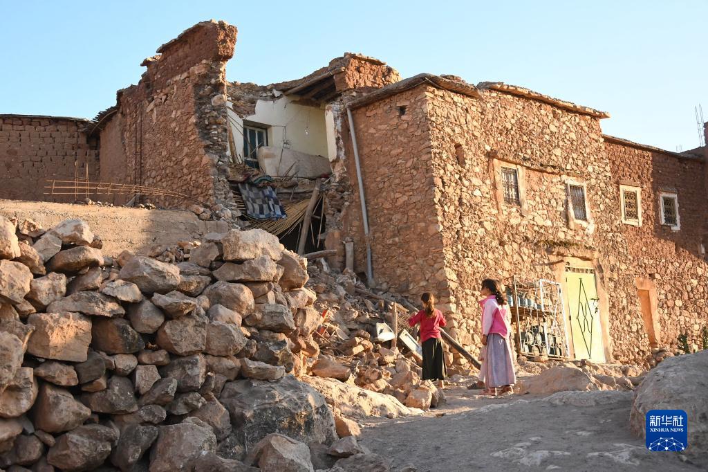 9月9日,在摩洛哥馬拉喀什附近,孩子們站在遭地震損毀的建筑旁。