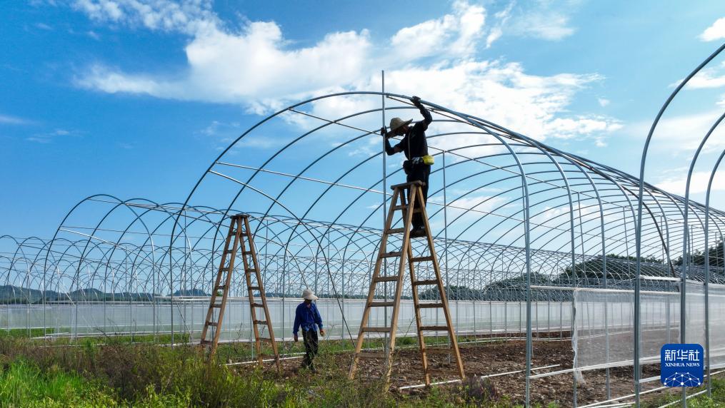 9月9日,工人在常寧市洋泉鎮巷坪村智慧育苗大棚施工現場施工。