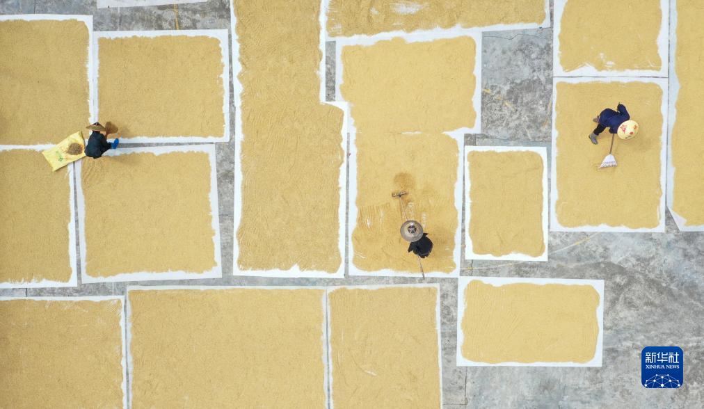 9月10日,村民在貴州省黔東南苗族侗族自治州從江縣剛邊壯族鄉三聯村晾曬稻谷(無人機照片)。