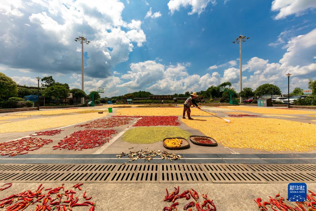 9月10日,在重慶市南川區黎香湖鎮西湖村,村民趁晴好天氣將收獲的紅辣椒、玉米、綠豆、豆角等農作物,擺放在地上進行晾曬。