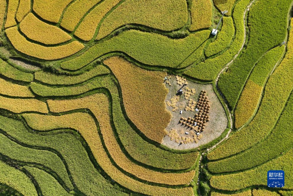 9月9日,農民在貴州省黔南布依族苗族自治州貴定縣沿山鎮臘利梯田收割水稻。