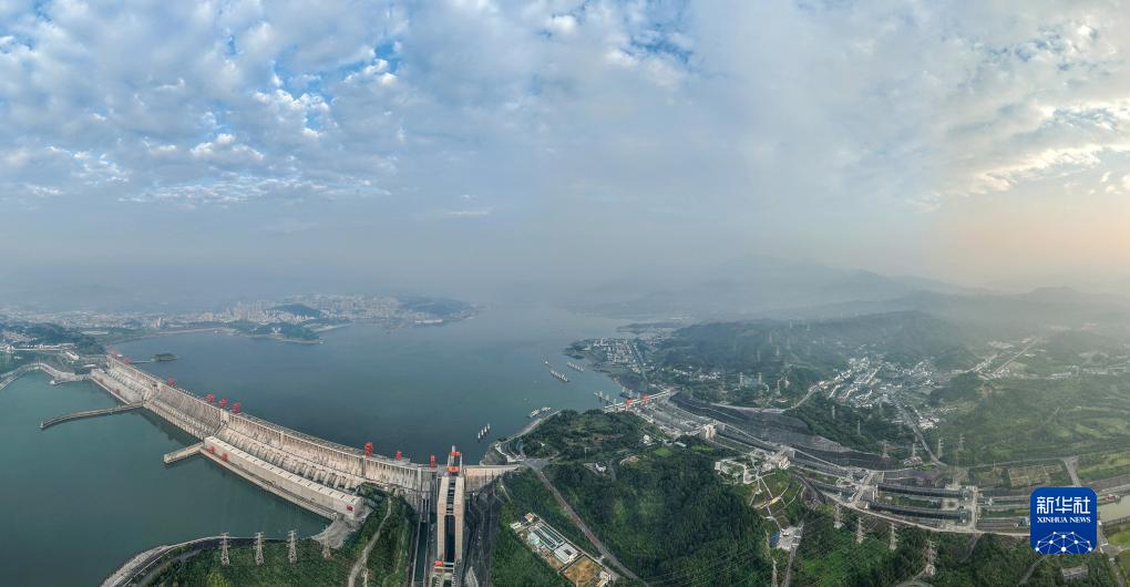 9月10日,船舶在湖北省宜昌市有序通過三峽雙線五級船閘(無人機全景照片)。