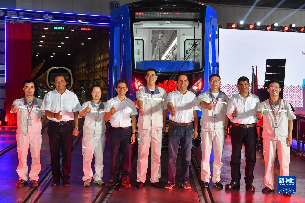 9月10日,墨西哥來賓和中車株機公司工作人員在中國中車出口墨西哥城輕軌列車首列車前合影。